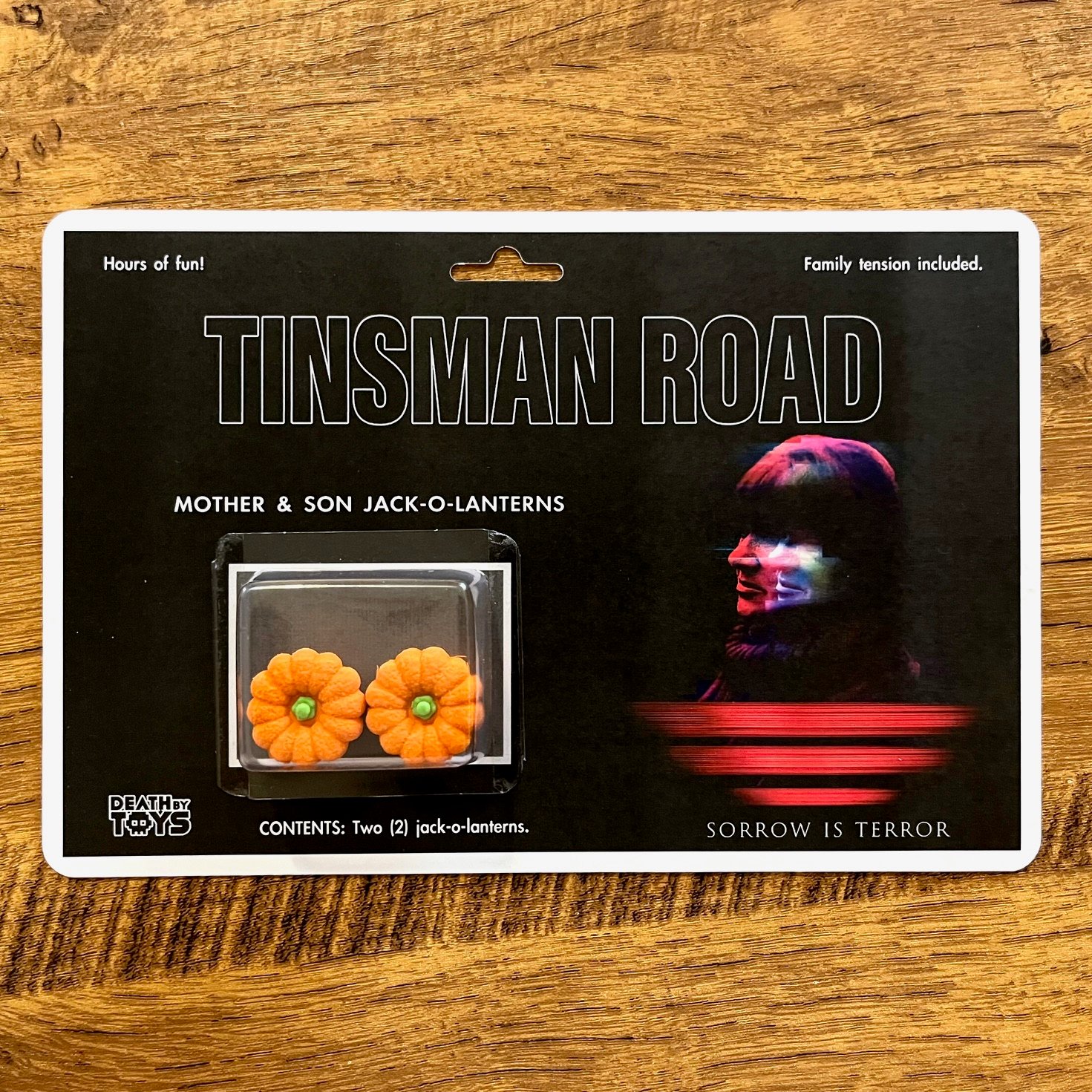 Re-enact your favorite scenes from Tinsman Road with these official pumpkins. Made from repurposed toys with additional handmade elements, each one comes mounted to a 6" x 9" cardback.