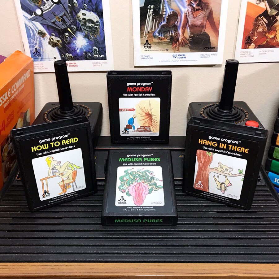 These are non-playable custom made Atari cartridges featuring the artwork of Porous Walker. Features a front and top label.