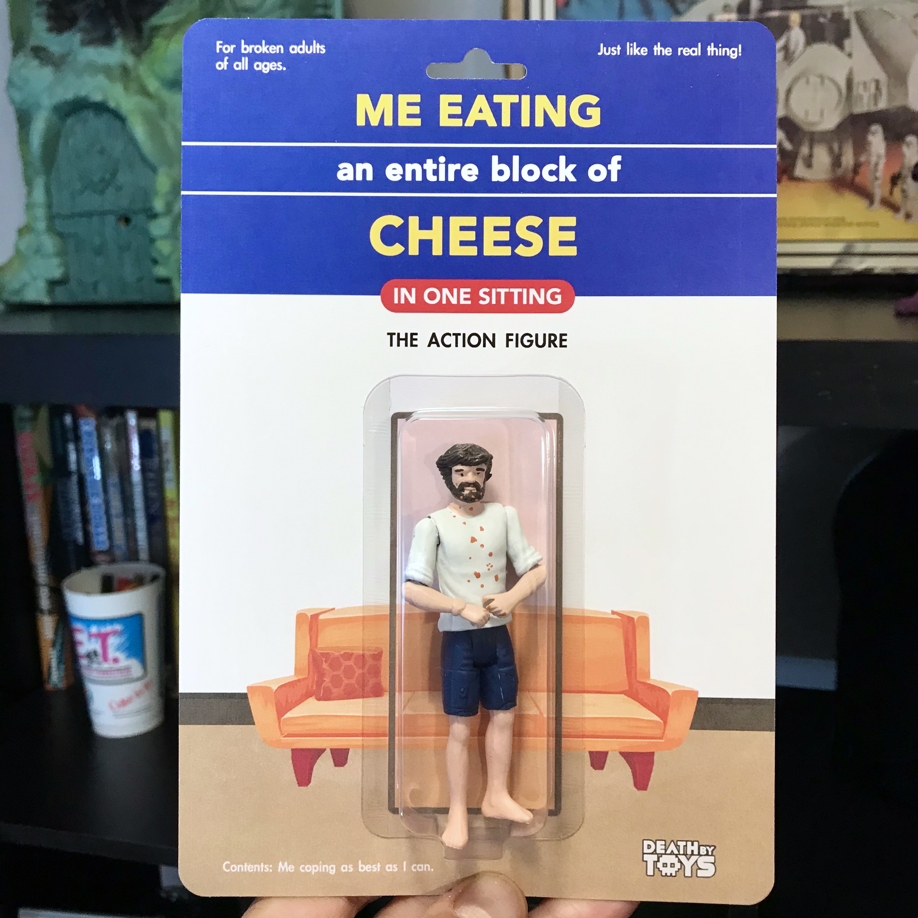 Celebrate self-care in all of its forms with this Eating a Block of Cheese action figure.