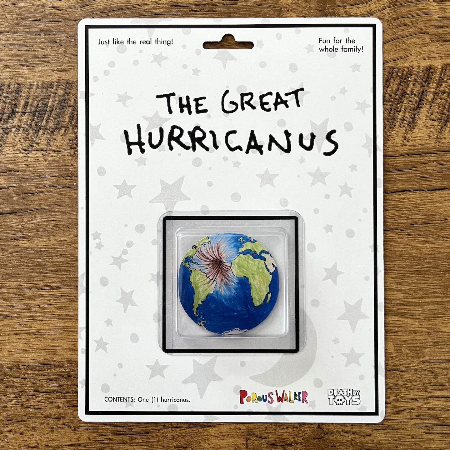 Based on Porous Walker's "The Great Hurricanus" illustration, each one of these pieces features a small wooden disc sporting the hurricanus. It comes mounted on a 6" x 8" cardback with nothing printed on the reverse side.