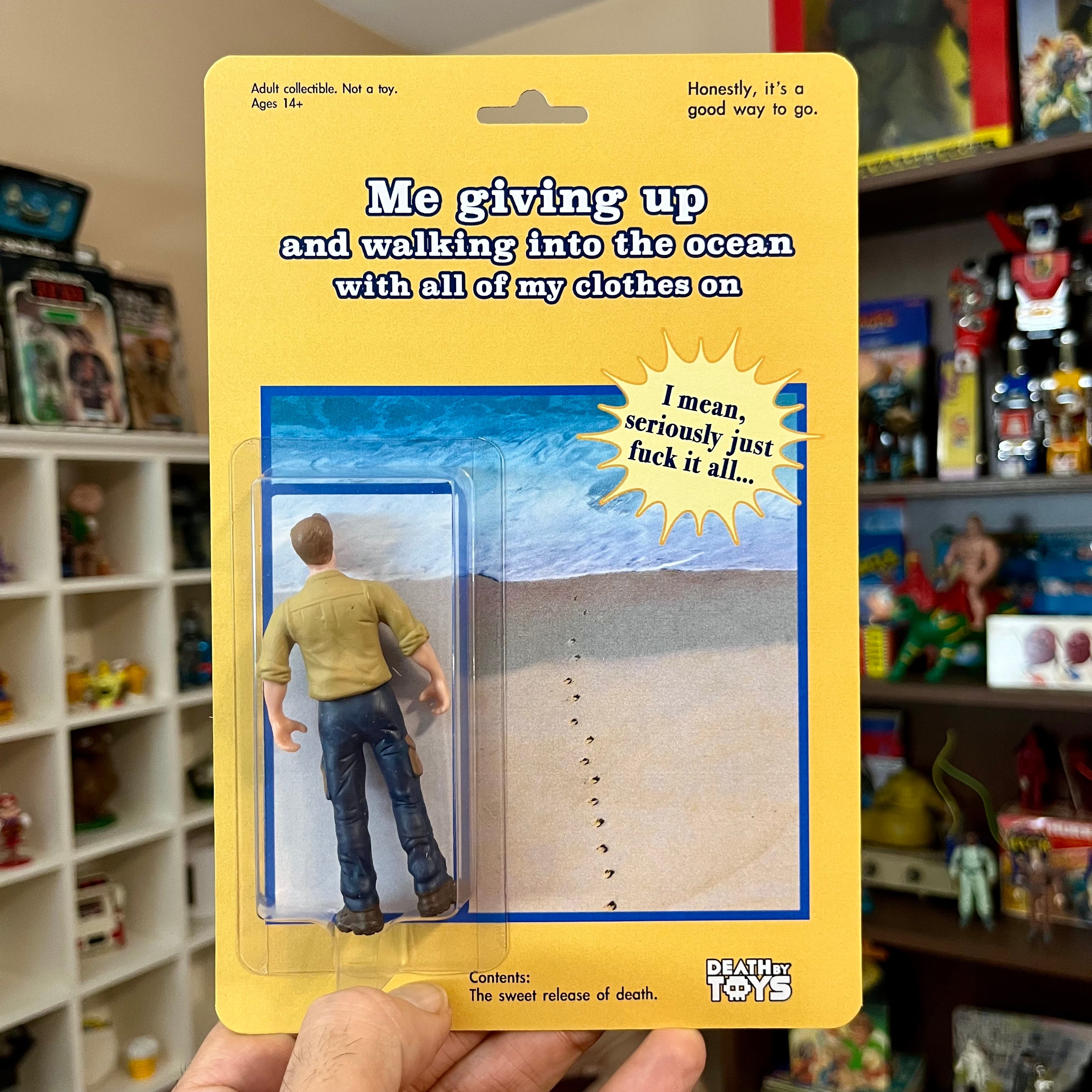 Celebrate giving up and walking into the ocean with this action figure. He is made from repurposed parts, and comes mounted against a single sided cardback with nothing printed on the reverse side.