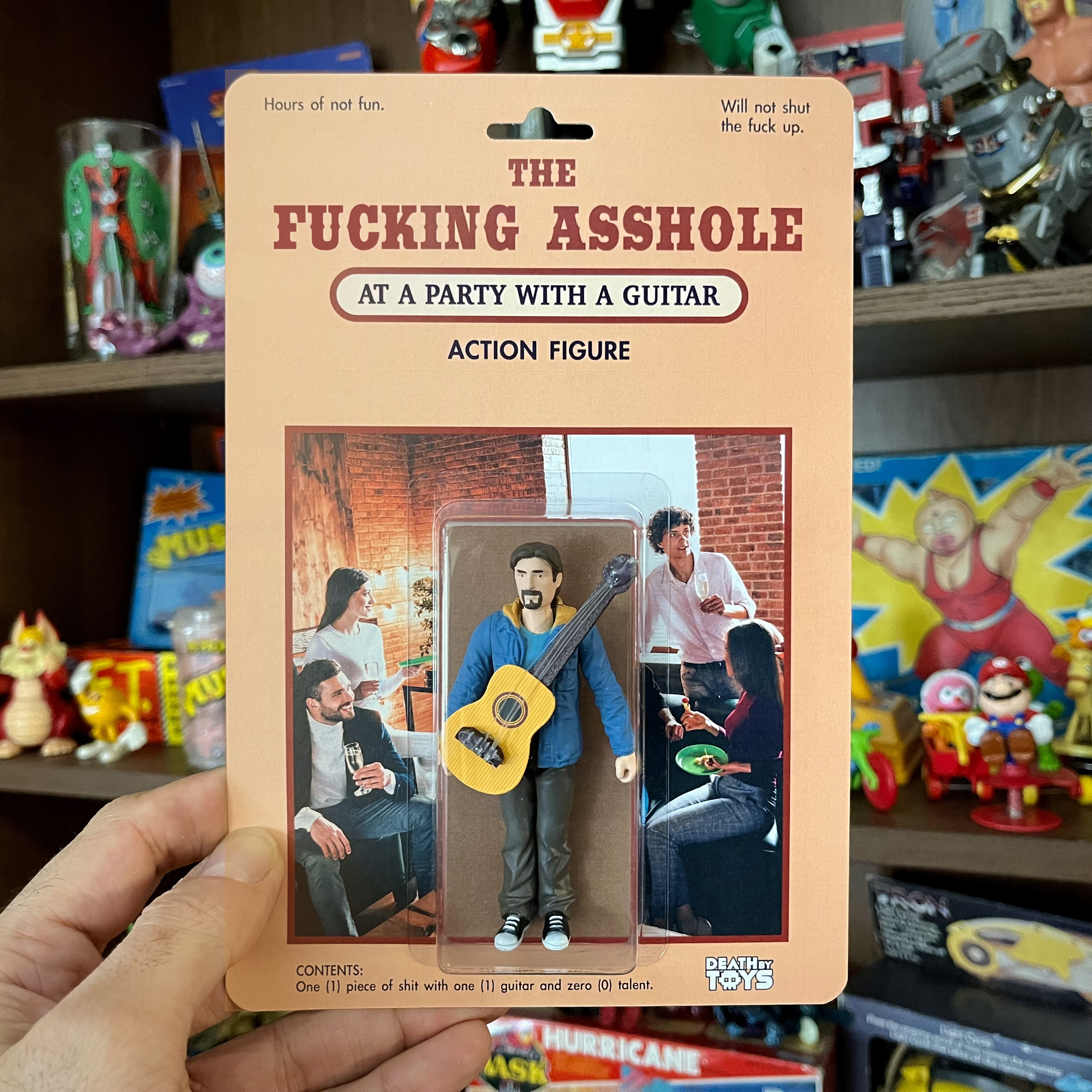 Celebrate the most hated person at any party with this one of a kind action figure. He comes complete with a tiny guitar and is mounted on a 6" x 9" cardback with nothing printed on the reverse side.