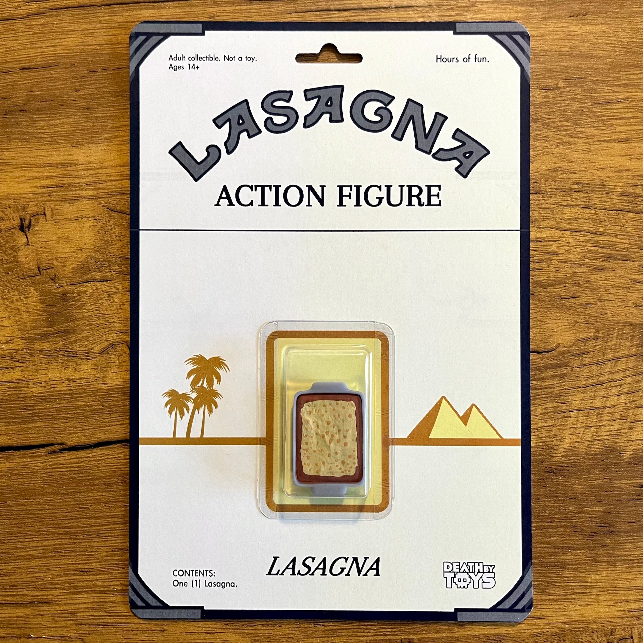 This little doll-sized lasagna has been packaged against a cardback that makes you want to light up a fresh pan. Every lasagna is 3D printed and hand painted. Because every piece is made by hand, minor imperfections will exist.
