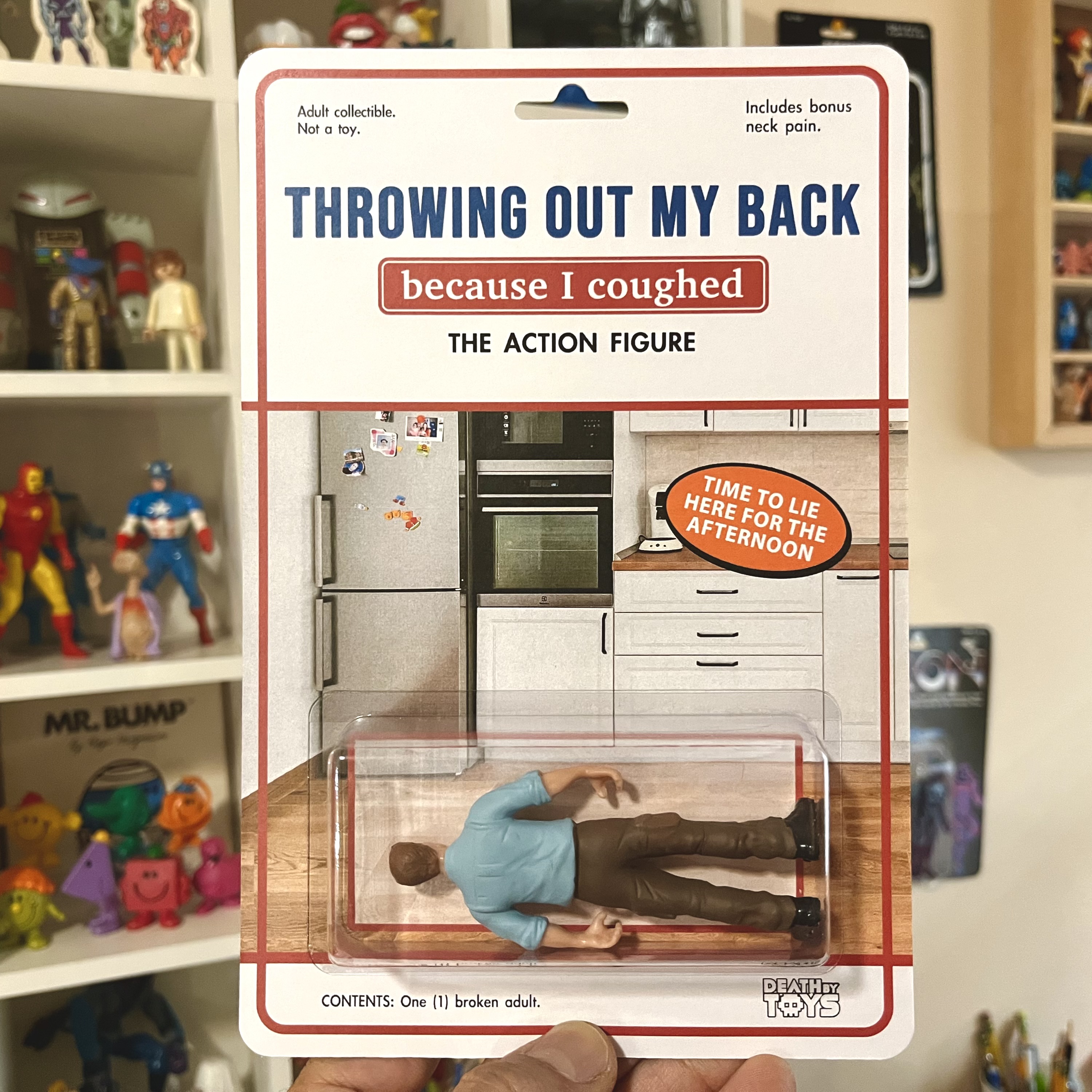 Experience the joy of having your entire body shut down because of something it did to itself. Anyway, that's what getting old looks like. This is made from a repurposed action figure with additional handpainted details. It comes mounted against a single sided 6" x 9" cardback.