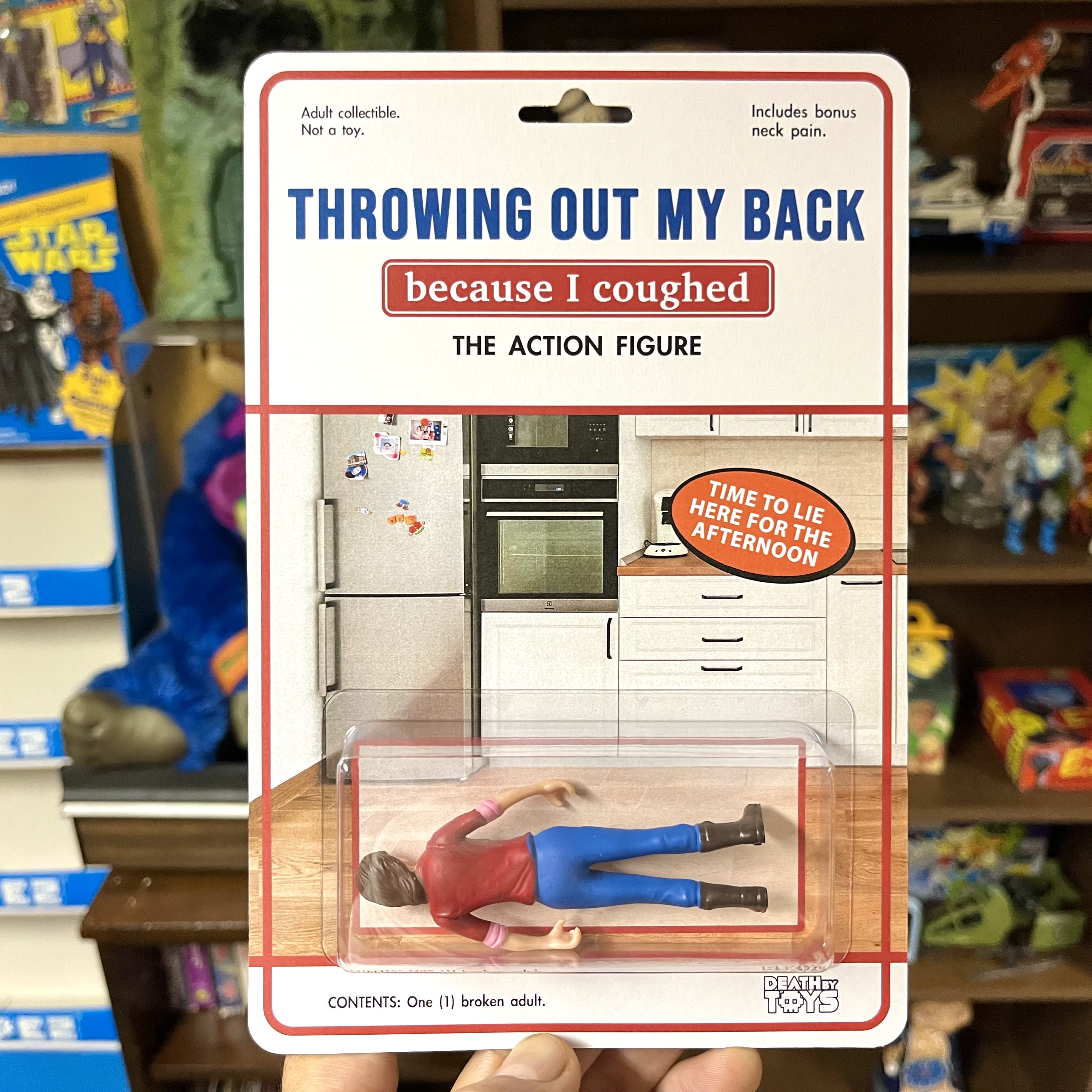 Experience the joy of having your entire body shut down because of something it did to itself. Anyway, that's what getting old looks like. This is made from a repurposed action figure with additional handpainted details. It comes mounted against a single sided 6" x 9" cardback.