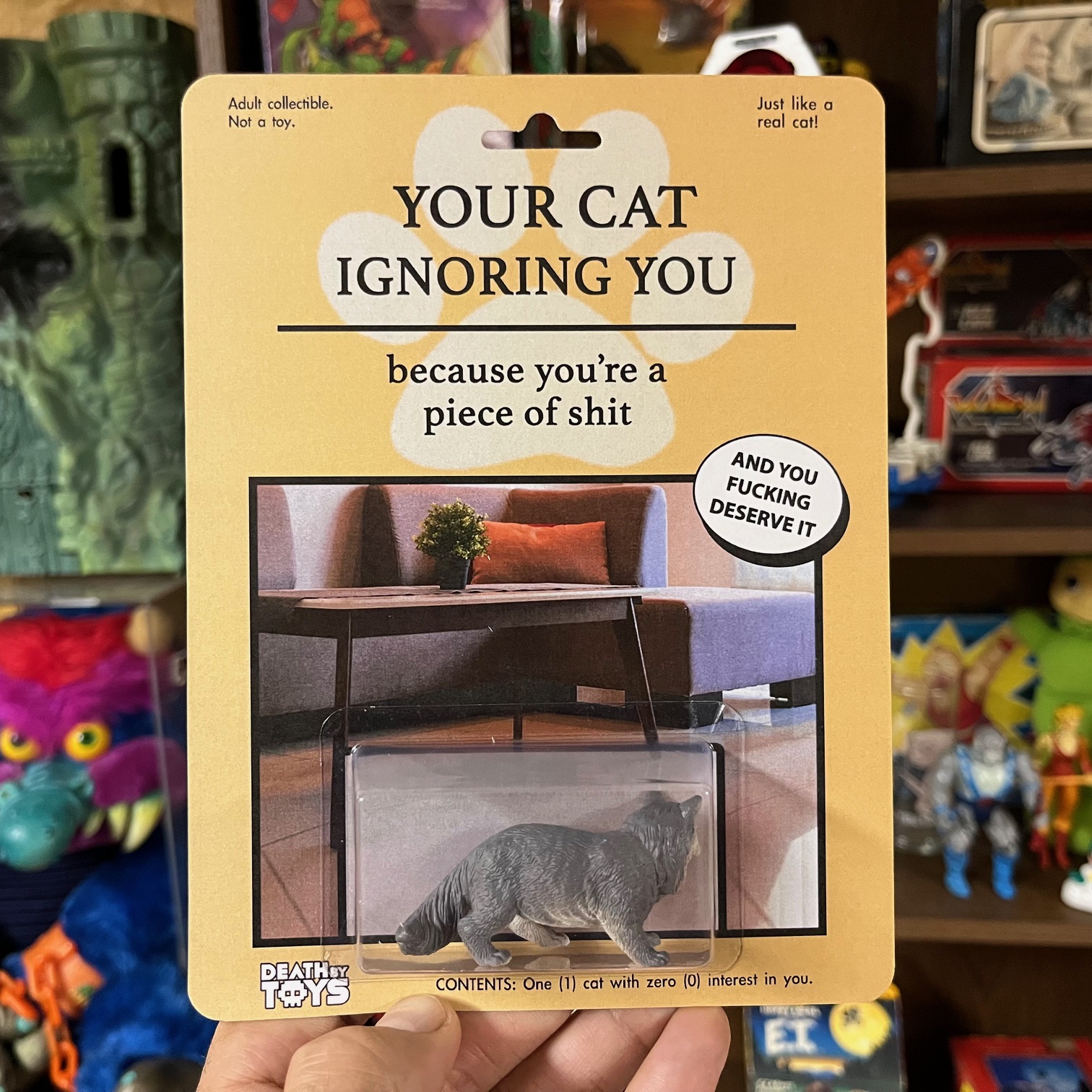 This miniature cat is 100% accurate in the sense that it doesn't care about you at all. It is made from a repurposed toy and comes mounted on a 6" x 8" cardback with nothing printed on the reverse side.