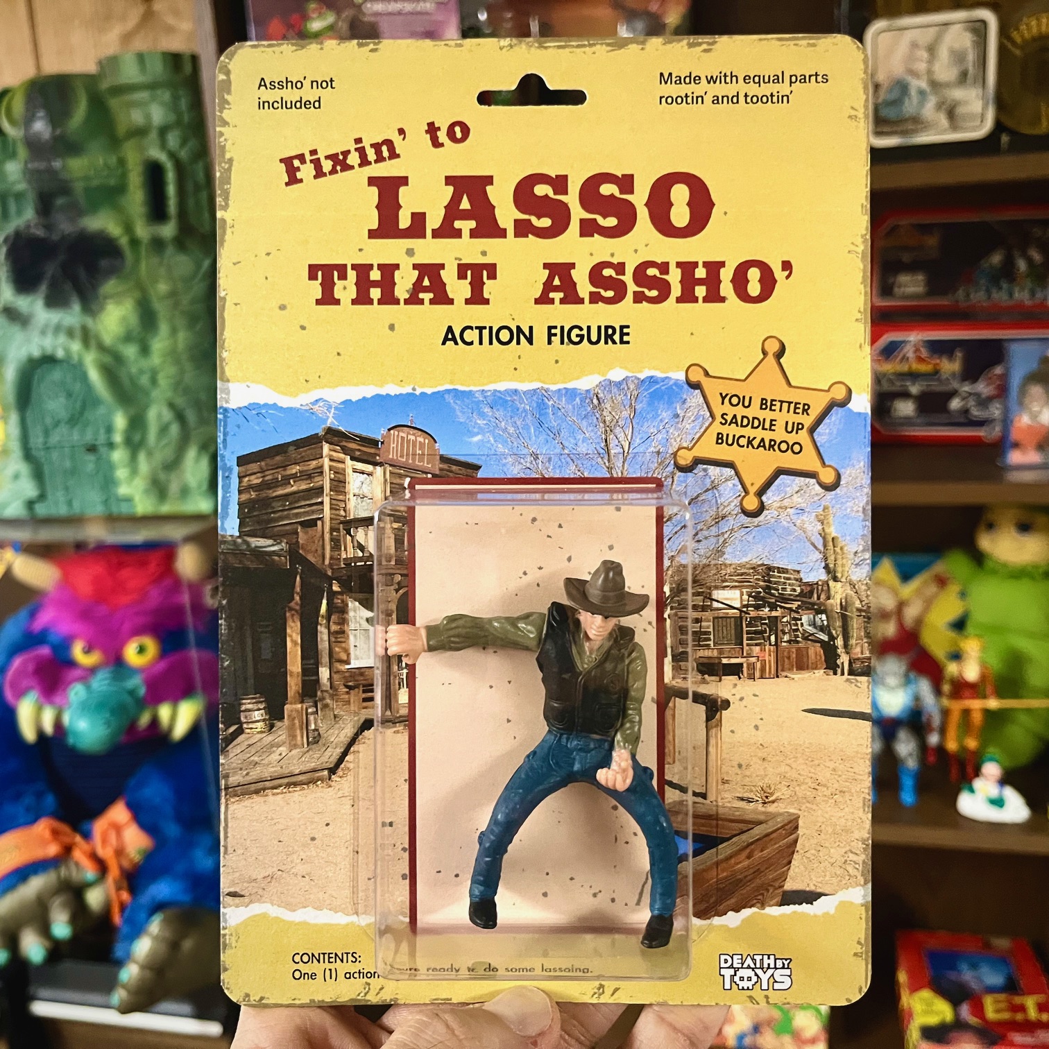 Saddle up buckaroo, because this cowboy action figure is ready to do some lassoing. He's made from a repurposed action figure and comes mounted to a single sided cardback with nothing printed on the reverse side.