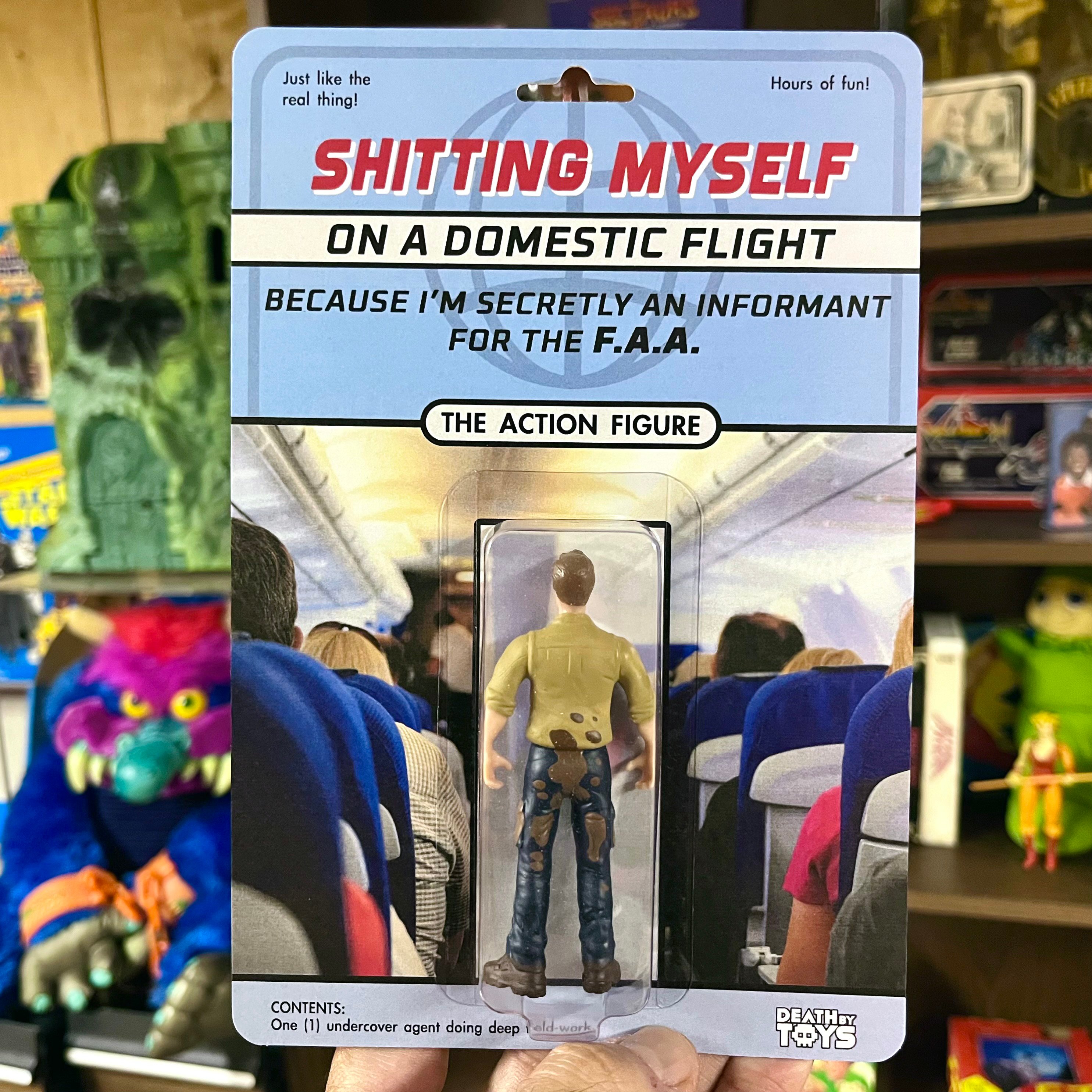 Yeah, this toy may look like it just had an accident on an airplane. But, the secret truth is that it's actually an informant for the FAA and this was all a test. Made from a repurposed action figure with additional handpainted details.